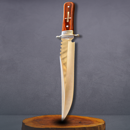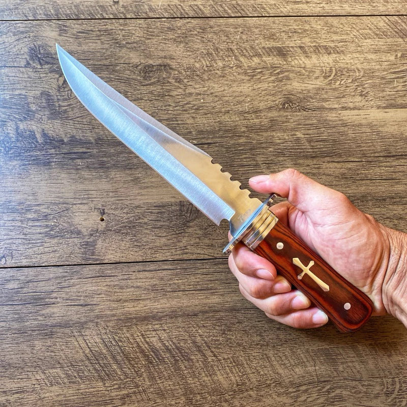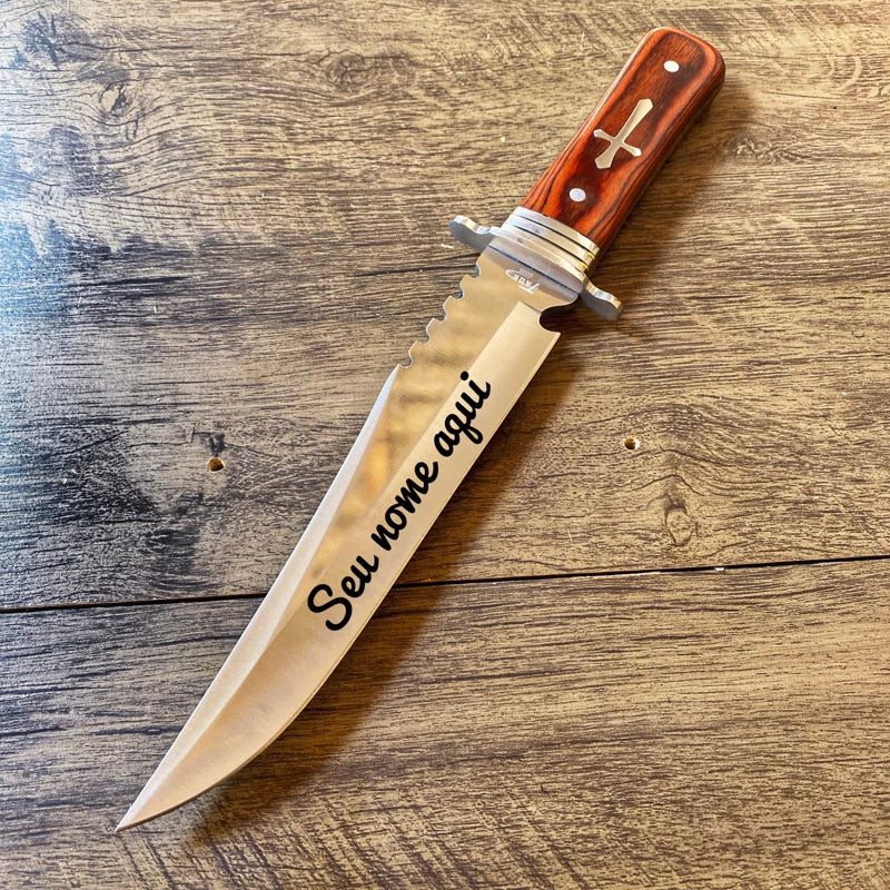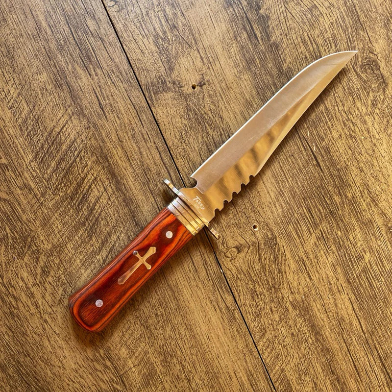 A Cruzada do Sul não é apenas uma faca. É um símbolo. Sua lâmina dourada carrega o brilho dos que enfrentam os dias com coragem e propósito. As serrilhas imponentes no dorso revelam sua força bruta, enquanto o cabo em madeira nobre com o emblema da cruz remete aos guerreiros que vieram antes de nós — os que lutaram, protegeram e lideraram.