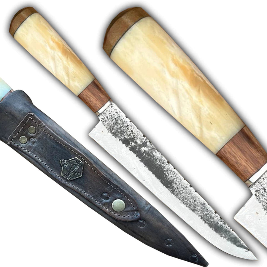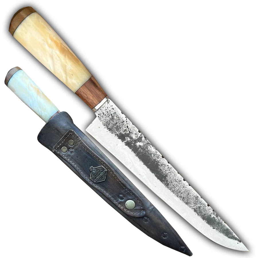 O cabo, feito em osso natural polido com detalhes em madeira nobre, oferece firmeza e conforto, transformando cada corte em um ato de precisão. A bainha em couro legítimo, costurada à mão, garante proteção e estilo para transportar a peça com segurança.