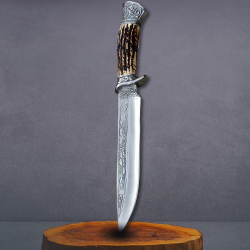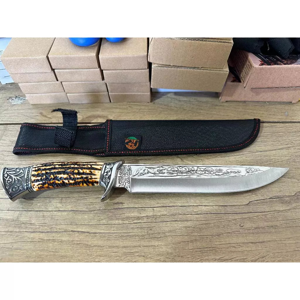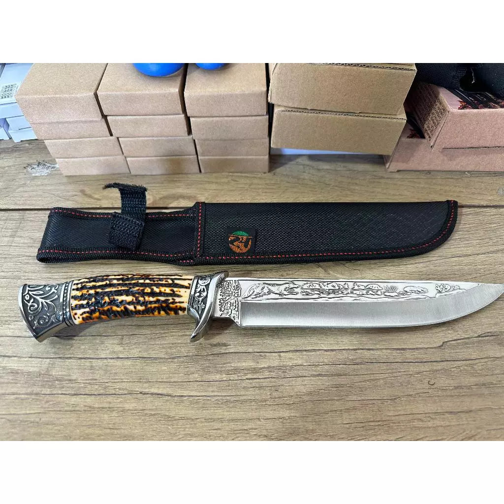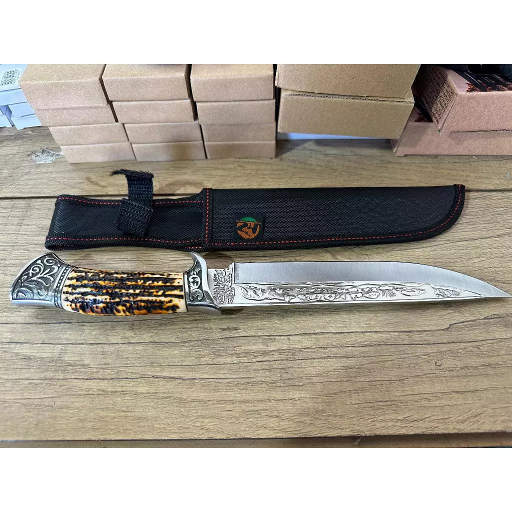 A Faca Sertão Imperial carrega em sua lâmina a alma do nordeste brasileiro. Inspirada nas armas dos vaqueiros antigos, ela foi redesenhada com traços de elegância nobre: desenhos entalhados, metais ornamentados e um cabo que remete ao chifre de gado nativo — um símbolo de força e bravura.